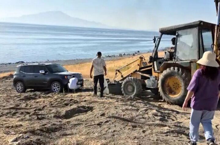 Van'ın Tuşba ilçesinde Ayanıs kıyısında yol aşınması nedeniyle mahsur kalan tatilcilerin yardımına mahalle muhtarı...