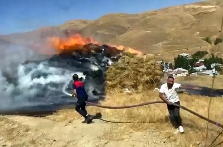 Hakkari'nin Yüksekova ilçesinde anız yangını, bir köylüye ilişkin 4 bin bağ otu kül etti....
