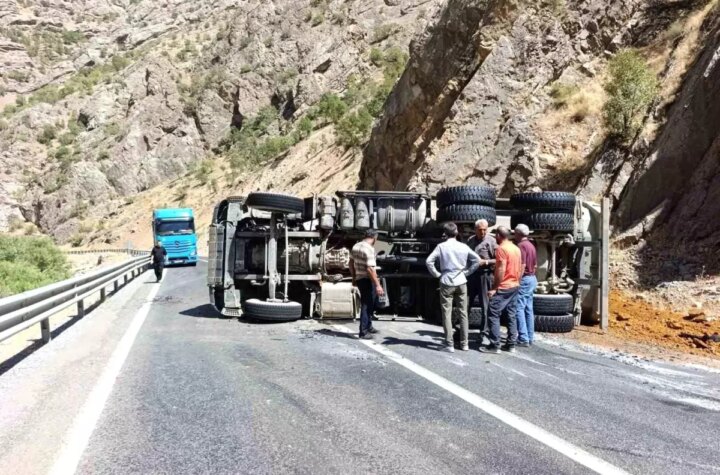 Hakkari-Çukurca yolunda maden yüklü bir kamyonun devrilmesi sonucu şoför hafif yaralandı. Kaza, Şine Dağı...